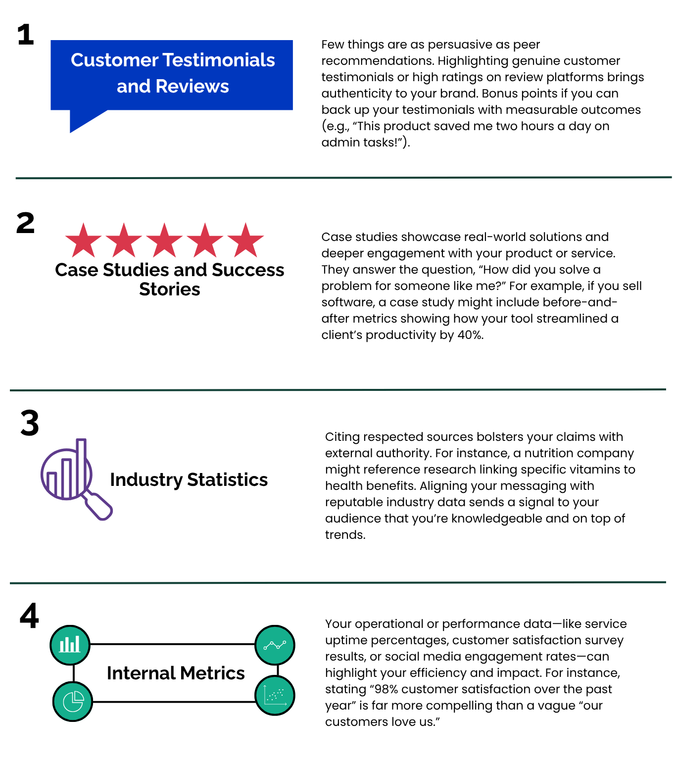 Too much information can overwhelm. Focus on the one or two most impactful data points, and avoid cluttering your message with unnecessary details. Remember, you’re not writing a research paper—you’re giving your audience clear evidence to trust your brand.