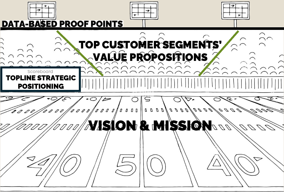 The scoreboard is the focal point for fans—it shows the stakes and keeps everyone aligned on the goal. Similarly, your topline strategic positioning is the overarching message that defines your brand’s value and competitive edge.